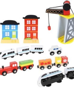Играчката стимулира креативността на най-малките и въображението. 5cm - тегло с опаковка: 4 кг. Сетът има сертификати CE и EN 71. Дървено цветно влакче с релси и аксесоари.