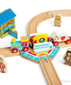 Дървен комплект с влакчета и голяма писта Bigjigs. Насладете се на крайбрежно приключение, докато влакчето-играчка и два вагона пуфкат покрай огромен пясъчен тунел, колиби на плажа, части от плажа, плажуващи ...