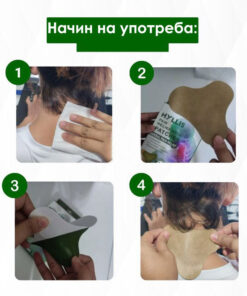 Просто почистете и подсушете зоната на врата, премахнете предпазната лепенка и залепете пластъра върху кожата. Премахнете предпазната лепенка Внимателно залепете лепенката на врата и загладете добре.