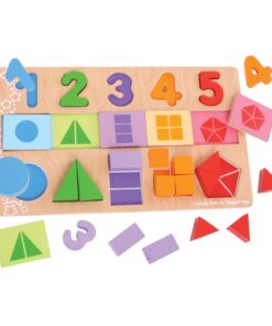 Дървен пъзел за деца с числа и форми Bigjigs. Този образователен пъзел въвежда броенето и концепцията за дроби, използвайки ярко оцветени дървени части от пъзел, които включват числа и форми.
