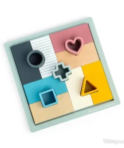 Този детски пъзел с форми е замислен като игра 2 в 1: първо детето съпоставя силиконовите форми с местата им, а след това подрежда дървените части върху основата.