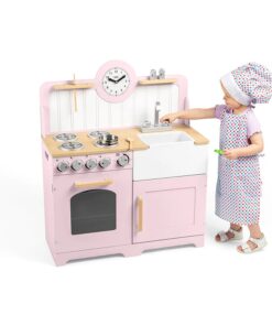 Детска дървена кухня кънтри Bigjigs. Тази реалистична дървена кухня за игра разполага с фурна и котлон с щракащи дискове, шкаф за съхранение, мивка Belfast, рафтове за прибори и часовник с подвижни стрелки ...