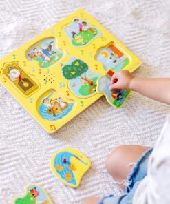 Дървен музикален пъзел Детски песнички Melissa & Doug. Пъзелът се състои от 1 дървена основа и 6 части, които могат да бъдат сваляни и слагани отново, като при всяко повдигане на съответната част, можете ...