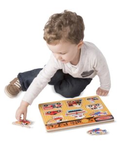 Дървен детски музикален пъзел с дръжки Превозни средства Melissa & Doug. Поставете правилно парче от пъзела на превозното средство в дъската с пъзела и го слушайте как звъни!