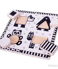 Дървен пъзел в черно и бяло с животни Bigjigs. Този дървен пъзел е специално проектиран в черно и бяло, поради факта, че черно и бяло са цветовете, които малките деца виждат и реагират най-лесно.