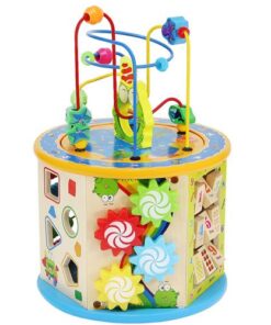 Този дървен куб е замислен като център за активности: детето може да редува подреждане, въртене, проследяване. Включени са поставяне на геометрични фигури в съответните отвори, игра със зъбни колелета, лабиринт с топчета, часовник ...