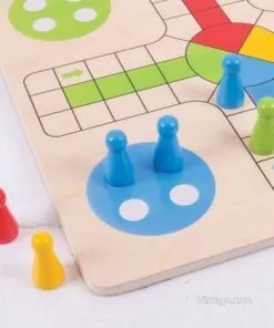 Играта е изработена от дърво, а пионките са в традиционните за играта цветове – зелен, жълт, червен и син. Всеки участник избира цвят и подрежда пионките си на стартовите полета със съответния цвят.