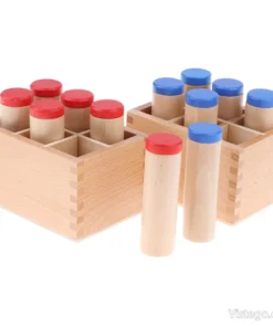 Комплектът е организиран в две групи цилиндри, които се различават по цвят на капачките — сини и червени. Материалът от дърво създава приятен допир и усещане за „истински“ предмети, което често насърчава ...