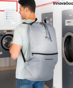 Цип за отваряне-затваряне в долната задна част. Раница за дрехи за пране InnovaGoods. Голям капацитет: размер XXL (50 x 75 см). Устойчив на вода и петна (полиестер 420D Оксфорд).