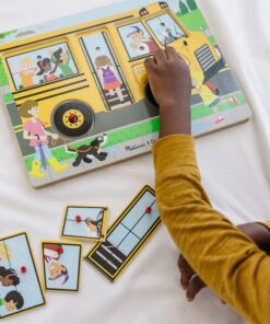 Дървен музикален пъзел с рими Автобус Melissa. Повдигнете шестте части от училищния автобус, за да разкриете различни картини отдолу, които показват какво се случва, и да чуете различните стихове на класическата ...