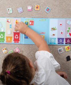 Тази образователна книга включва няколко игри за сортиране, увлекателна информация за рециклирането и 2 листа с магнити, които да подпомогнат. Магнитна книжка за деца Рециклирам Bigjigs.