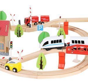 Дървена писта с влакчета и коли - детска играчка. Комплектът включва писта, влак, 2 коли, полицейски хеликоптер с площадка за кацане, камион с ремарке, мъже, гара, полицейска сграда с гаражно място, мост ...