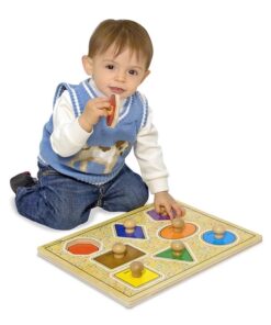 Пъзел с дръжки за деца Геометрични фигури Melissa & Doug. Този изключително здрав дървен пъзел включва очарователна къщичка с пет големи части от пъзел. Страхотна дейност за насърчаване на координацията ...