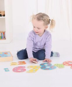 Всеки пъзел е с брой части, отговарящи на цифрата. Частите са в удобна дървена кутия с плъзгащ се капак. с удобни за хващане части, които детето ще трябва да подреди.