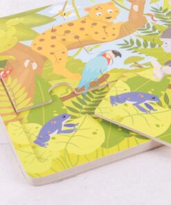 Дървен пъзел за деца в рамка Джунгла Bigjigs. Изработен от висококачествени материали с отговорни източници. Други тематични мозайки са налични в гамата Bigjigs Toys Puzzle.