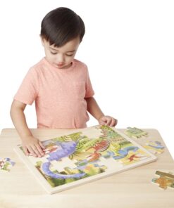Дървен детски пъзел с динозаври в рамка Melissa & Doug. Драматична праисторическа сцена оживява, когато дървените части на мозайката се сглобят! Ярко илюстриран с детайли на динозаври, този пъзел от 24 ...