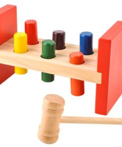 Цветните елементи привличат погледите на детето и го насърчават да се забавлява. Детска дървена играчка с чук и цветни блокчета. Детето може да практикува знанието си за цветове и дори да практикува броене ...