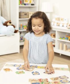 Дървен пъзел Изписвай думи на английски език Melissa & Doug. Повече от 50 цветни дървени букви се побират в осемте двустранни изрязани дъски, за да изписват думи от три и четири букви.