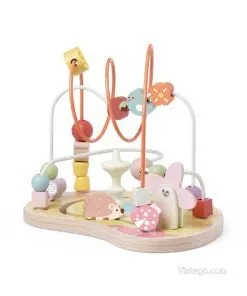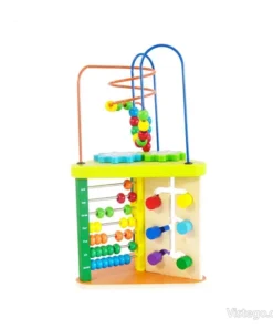 В горната част са разположени два лабиринта с цветни мъниста, както и две шарени зъбни колела, които добавят още варианти. В комплекта занимания детето открива сортер с геометрични фигури, шарено сметало ...