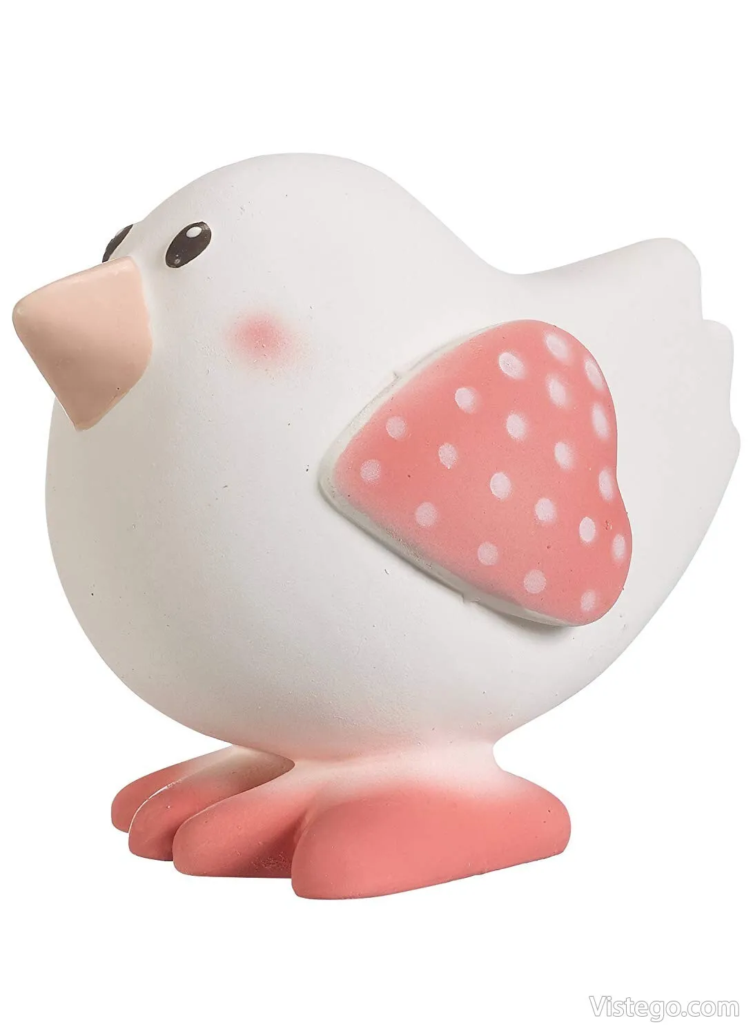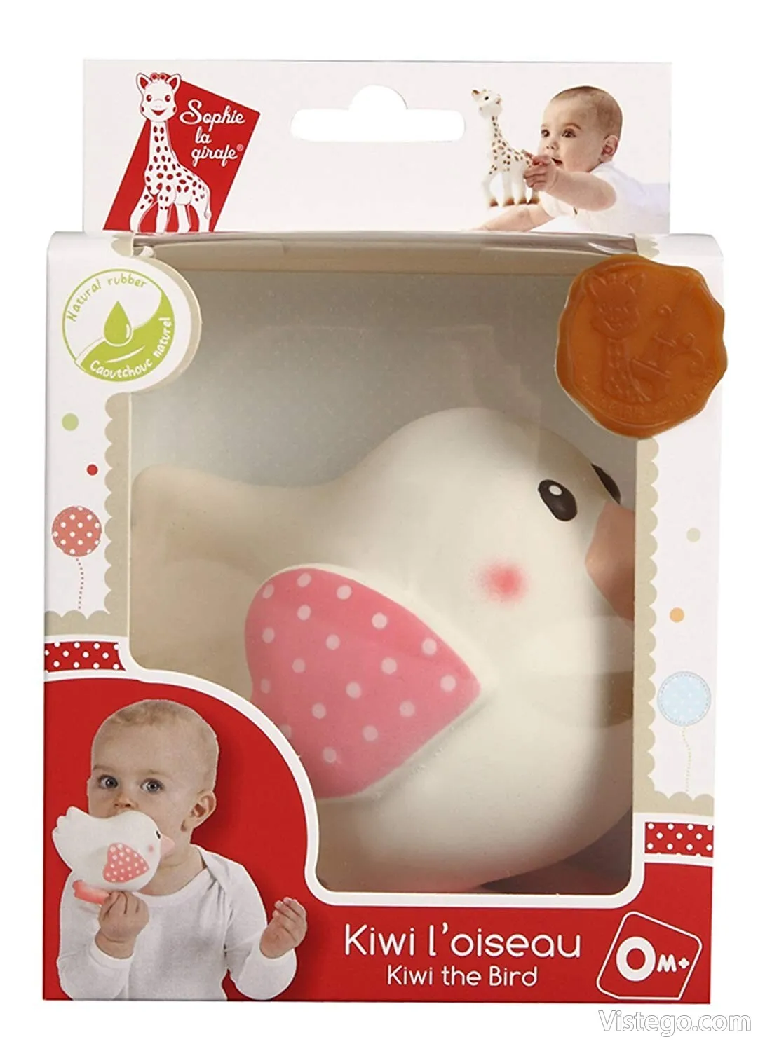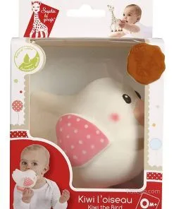Тази бебешка играчка е оформена като симпатична птичка с име Киви и е направена така, че детето да я изследва по различни начини. Играчката е мека на допир и предразполага към гушкане, а характерният аромат на каучука прави усещането още по-разпознаваемо за малките. Благодарение на живите цветове бебето лесно открива играчката и я следи с поглед, което превръща всяко протягане и хващане в малка победа.