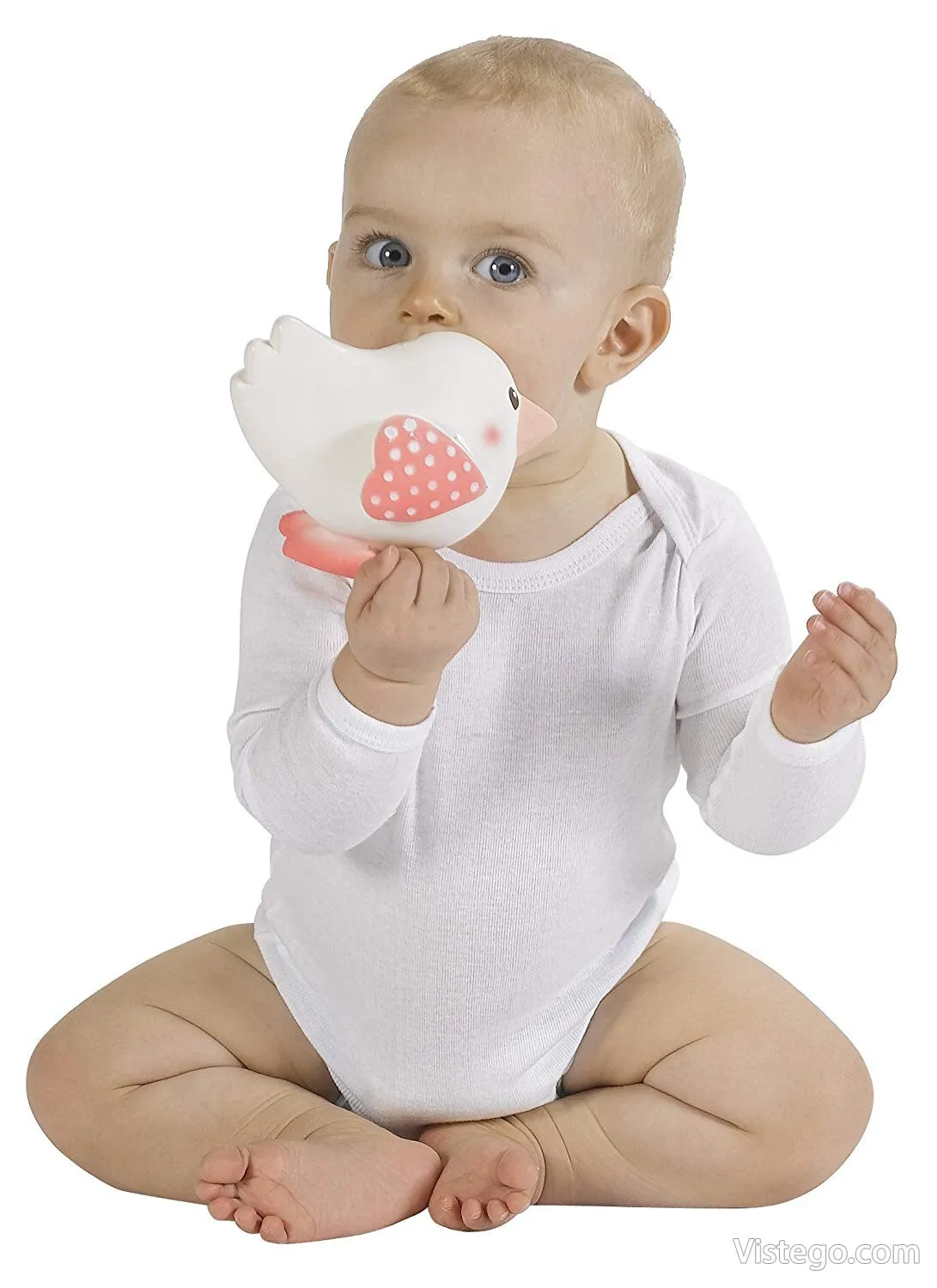 Когато бебето стиска и мачка птичката, то упражнява хват, координация и контрол на движенията. Вградената пищялка добавя звуков стимул и прави реакцията на играчката ясна и забавна, което насърчава повторението на действията. Меките части на птичката са практичен избор в периоди на сърбящи венци, тъй като детето естествено търси нещо приятно за допир и дъвчене. Така играчката птичка се вписва както в спокойните моменти, така и по време на активна игра.