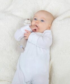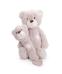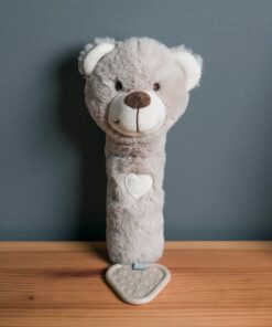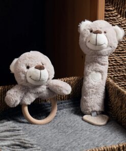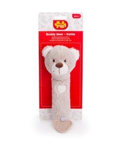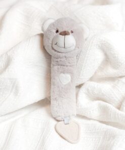 Бебешка мека дрънкалка Меченце Bigjigs. Дрънкалка и гризалка всичко в едно. Тази супер мека плюшена дрънкалка е изработена от мек и безопасен материал, който е нежен за кожата на бебето. Създадена да подпомага развитието на бебето чрез сензорна игра, тази дрънкалка е перфектният подарък за новородено и със сигурност ще се превърне в любимо място за лягане. Успокойте никнещите венци със здравата гризалка, прикрепена към дъното, или я стискайте, за да чуете сладкото скърцане. Специално проектиран в неутрален цвят, което го прави идеален за всяко бебе и гарантира, че малките умове няма да бъдат претоварени през първите месеци. Перфектен размер за малки ръчички, докато се учат да докосват, усещат и хващат. Отговаря на настоящите европейски стандарти за безопасност. Подходящ от раждането. Разгледайте още от категорията “Бебешки играчки” ТУК
