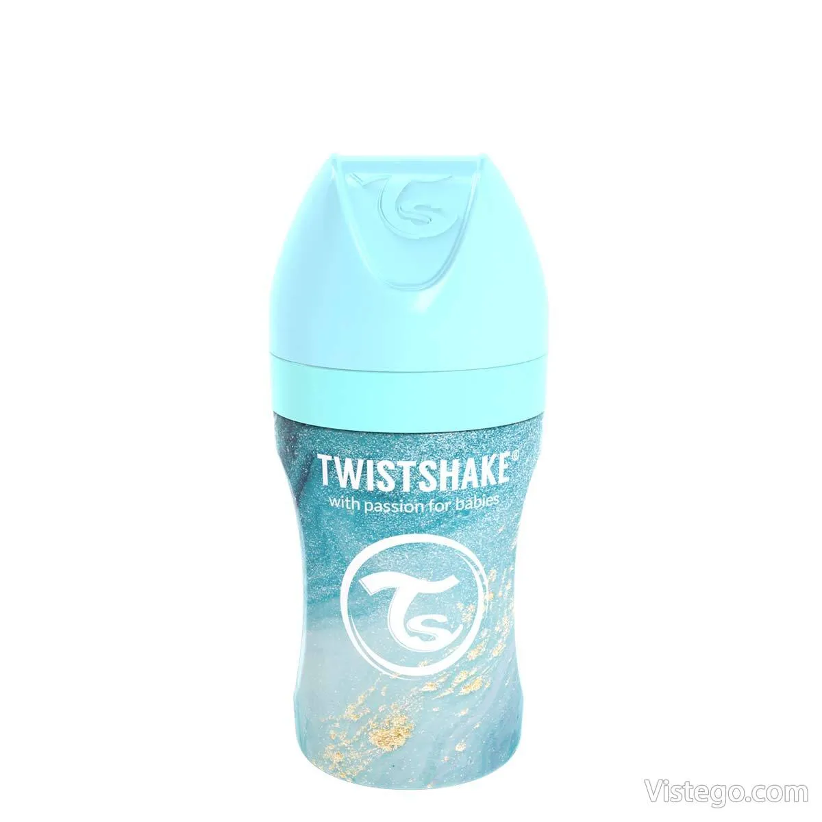 Бебешко шише Twistshake от неръждаема стомана с широко гърло, ергономичен захват и анти-колик клапа, в Мраморно синьо.
