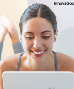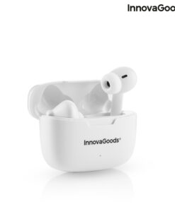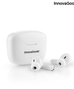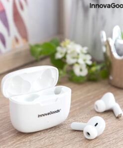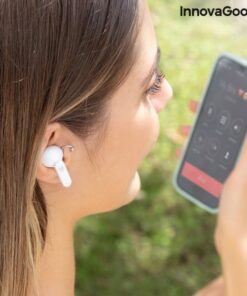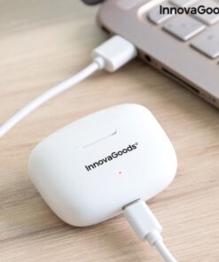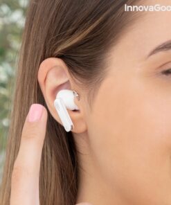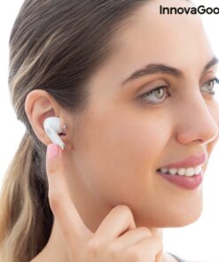 Безжични слушалки за телефон с Bluetooth InnovaGoods. Безжични сензорни слушалки с калъф за зареждане, идеални за слушане на музика навсякъде удобно и със съраунд звук. Можете също да отговаряте на повиквания и да активирате гласовия асистент. Техният безжичен и ергономичен дизайн на ухото позволява пълна свобода на движение. Тези безжични бързо зареждащи слушалки за поставяне в ушите са много удобни и лесни за използване благодарение на тяхното сензорно управление, тъй като просто трябва леко да докоснете слушалките, за да активирате техните функции, без да са необходими бутони. Те имат гумички, които се адаптират към ушите и осигуряват оптимално задържане, така че са идеални за използване по време на упражнения или спорт. Разполагат с вграден микрофон, BT 5.0, обхват от прибл. 10 м и включват USB към микро USB кабел. Прибл. времето за зареждане на слушалките варира между 1 и 1,5 часа, а времето за използване е до прибл. 3 часа. Времето за пълно зареждане на базата е прибл. 5 часа и има LED индикатор, така че слушалките могат да се зареждат до 5 пъти, когато основата е напълно заредена. Честотата (Hz) е от 2,402 GHz – 2,480 GHz.