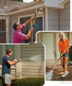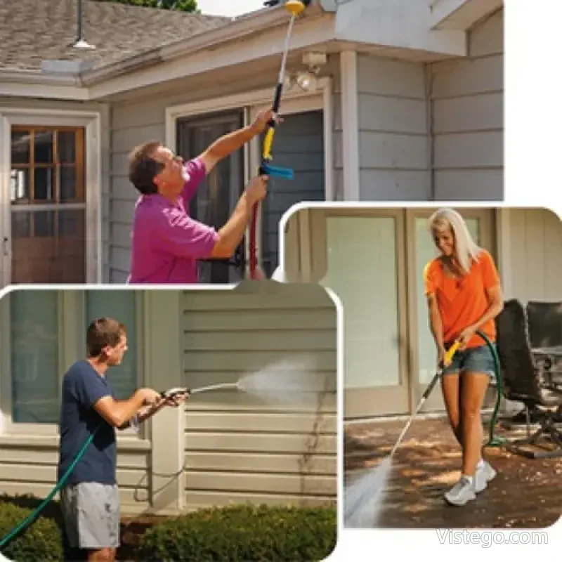 Водоструйната система е подходяща за поддръжка на градински мебели и чадъри, както и за освежаване на различни външни повърхности. Може да помогне при премахване на плесен, мухъл и наслоявания от мръсотия, когато искате по-целенасочена струя. При нужда от по-широко покритие използвате универсалното приспособление за разпръскване, а когато търсите по-концентрирана почистваща сила – сменяте към месинговия край. Практично е и когато искате да достигнете по-високи места, като насочвате струята нагоре, без да разчитате на стълба.