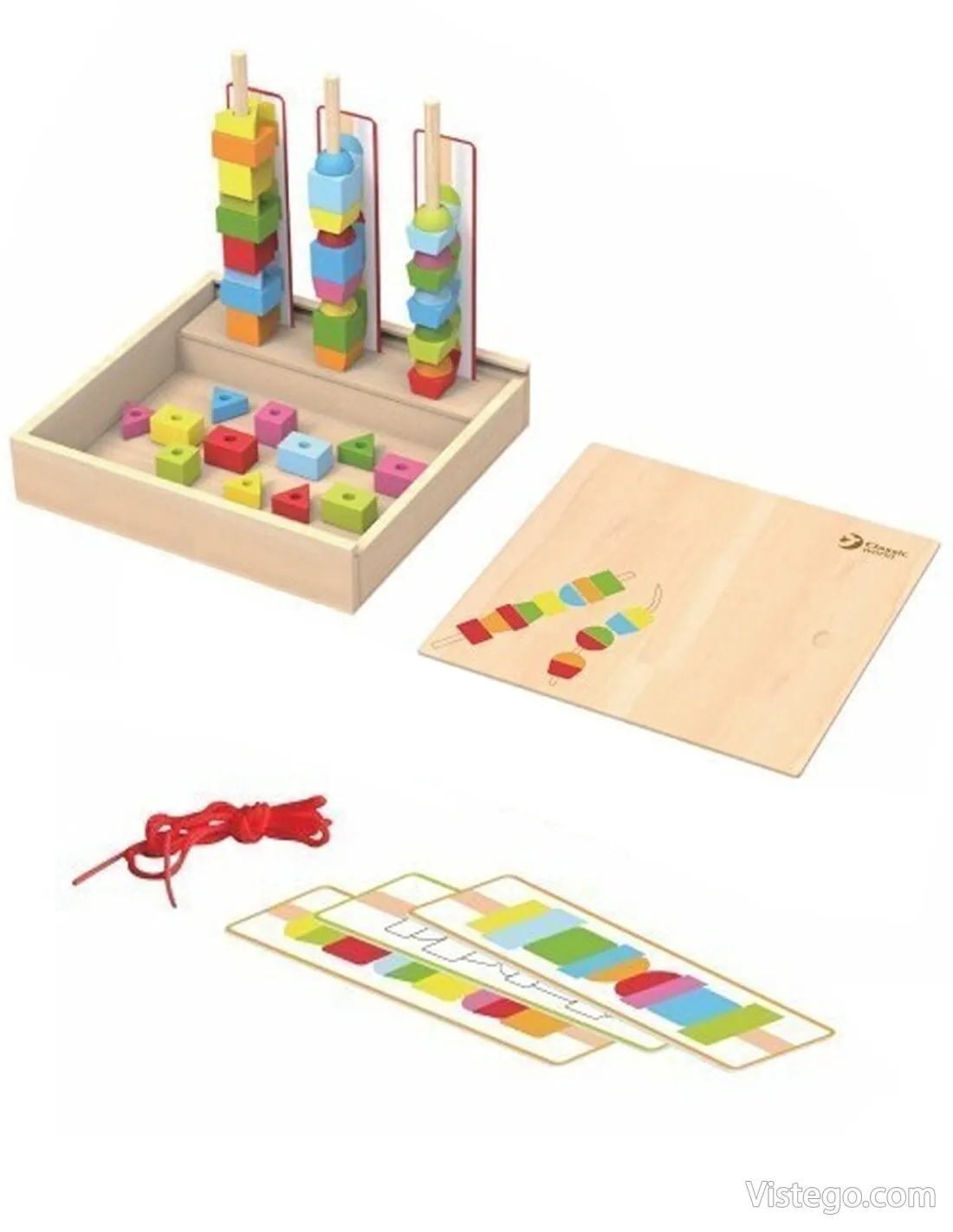 Този комплект е дървена играчка за подреждане, създадена като образователна игра за малки и по-големи деца. В кутията има няколко вида разноцветни дървени геометрични блокчета и основа с пръчици, които служат за нанизване и подреждане. Към пръчиците са прикрепени картинки, а задачата е детето да подреди блокчетата така, че да възпроизведе фигурите от изображенията. Така играта с геометричните форми става целенасочена и лесна за разбиране още от първия досег.