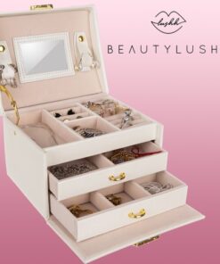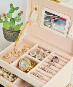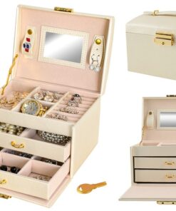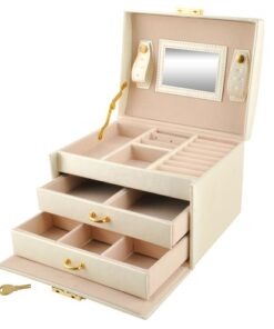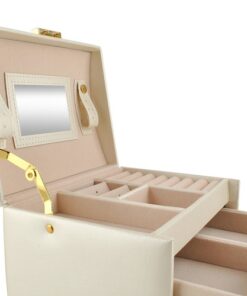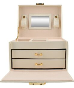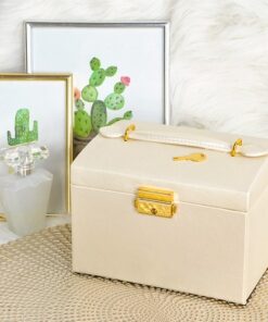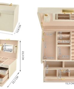 Голяма кутия за бижута и часовници в бежов цвят. Разполагате с 20 различни отделения и вдлъбнатини, благодарение на които винаги ще имате перфектно подредена колекция от бижута и аксесоари. Разполагате с ключ за допълнителна защита. Отделенията са облицовани с мек материал, за да предпазят деликатните и ценни предмети от надраскване. Издръжлив модел, приятна форма и златисти елементи придават класа на кутията; естетичен, привлекателен външен вид. Разгледайте още продукти в категорията “Подарък за жена” – ТУК