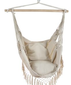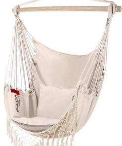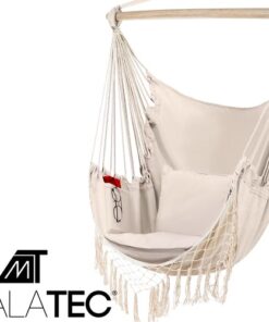 Голям градински стол-хамак в бежов цвят. Седалката на креслото MALATEC е просто огромна! До 120×150 см, толкова голяма седалка ще ви позволи да почивате прекрасно в градината, на терасата, балкона или в стаята. Освен това максималното натоварване е 150 кг, което ще ви позволи най-висок комфорт и безопасност. Материалът осигурява подходяща вентилация, която поддържа комфорта при използване на висящя стол дори в горещите дни. Освен това добавихме две много удобни възглавници към люлката. Масивно метално колело за монтаж е свързано с издръжливи въжета, равномерно разпределени по ширината на хамака чрез дървена напречна греда. Този дизайн го прави лесен за окачване, а хамакът е добре балансиран и стабилен. Допълнително предимство е много дългата верига за сглобяване, дълга до 2 метра за окачване, така че можете да закачите хамака дори на висок клон. Благодарение на факта, че хамакът има дървена напречна греда, позволява удобна стойка по време на почивка. Можете да четете и наблюдавате околността свободно. Перфектен за постоянен монтаж в градината, на терасата или в стаята. Разгледайте още продукти в категорията “Къмпинг оборудване” – ТУК!