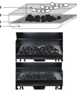 – ВКЛЮЧЕНО: скара с капак; окачена решетка; решетка за печене с отваряща се скара; решетка за въглища (тава); долен рафт; странични и предни рафтове – сгъваеми; 2x колело; обковни елементи; 2x дръжка за сваляне на решетката, инструкция на полски език, шпатула, вилица и щипка, духалка, 2 тефлонови стелки