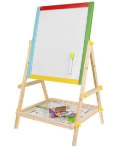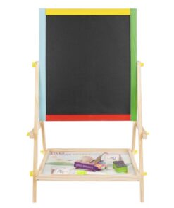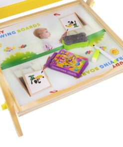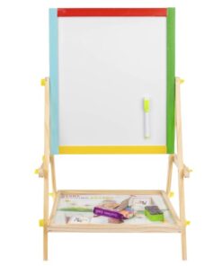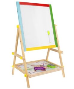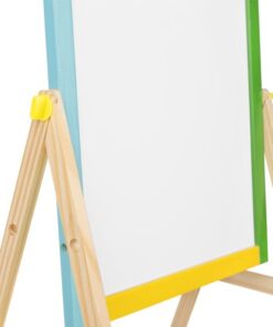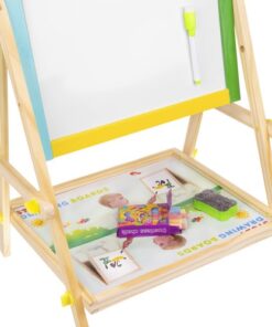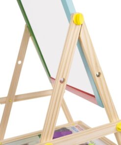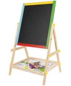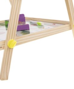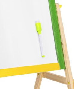 Двулицева дъска за рисуване с маркери и тебешири. Дъската може да се монтира по два начина. Може да е черна тебеширена дъска или бяла магнитна дъска. Комплектът включва големи винтове, които ще ви позволят удобно да сменяте позицията. Рамката на многофункционалното учебно табло е изцяло от дърво. Всяка част е боядисана с различна боя – жълта, зелена, синя и червена. Всичко е перфектно излъскано и безопасно за най-малките. Образователното табло стимулира въображението и креативността, а също така упражнява ръчни умения при най-малките. Забавлението никога не свършва. Черната дъска не само забавлява, но и учи на търпение и развива концентрация. Това е страхотна идея за подарък за всяко малко дете! Отдолу има рафт, който ще ви позволи да съхранявате например тебешир или други малки играчки. Включва: двулицева дъска, гъба, 3 тебешира и маркер.
