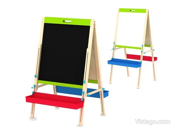 Моделът е изработен като статив с две лица: от едната страна повърхността е бяла, а от другата – черна. Това позволява детето да редува писане с маркер и рисуване с тебешир, без да сменя продукта. Конструкцията е предвидена за домашна употреба, като дъската стои изправена на четири дървени телескопични крака. В комплекта има и упътване за сглобяване, което улеснява подреждането и подготовката преди първото използване.