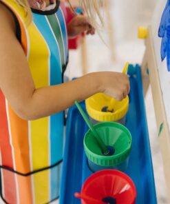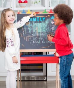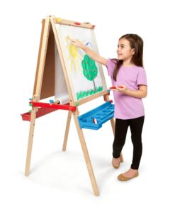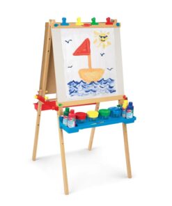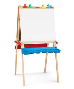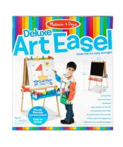 Детска двулицева дъска за рисуване Melissa & Doug. Melissa & Doug Deluxe Art Easel превръща всяка стая в художествено студио! Нашият двустранен художествен статив с детски размер включва дъска за сухо изтриване, черна дъска, заключващ се държач за хартиена ролка (побира 45,7 см или 30,4 см широка хартиена ролка), безопасен за деца нож за хартия, четири щипки за лесно захващане, и пластмасова тава за прикрепяне към всяка страна на статива. Сглобява се лесно, така че няма много време да чакате следващия шедьовър! Детските стативи се препоръчват за изграждане на фини двигателни умения и правилно захващане на молива – страхотно е за начинаещи! Използвайте черната и бялата дъска като идеални повърхности за упражнения за първите букви и думи на детето. Стативът разполага със здрава дървена рамка, сгъва се за съхранение, а височината се регулира, така че децата да могат да творят удобно. Дървеният статив е чудесен подарък за деца на три и повече години за практическа игра без екран. Разгледайте още от категорията “Образователни играчки” ТУК!