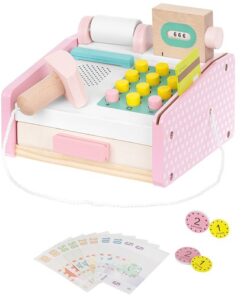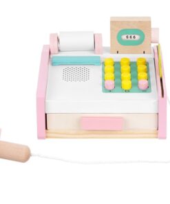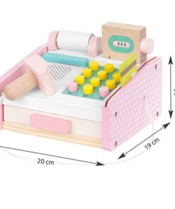 Детска дървена играчка каса за магазин. Детската каса за игра е фантастичен комплект, който обучава по игрови начин. Изключително реалистичен детски касов апарат с продуктов скенер, „истински“ пари и разплащателна карта е играчка, на която никое дете не може да устои. С детската каса всеки път ще е забавно и по-реалисично, когато играете в магазина. Касовият апарат е идеален начин да играете творчески с вашите родители или група връстници. Има изтеглящо се чекмедже за пари, което можете да използвате, за да скриете плащането за продукти. Това обаче не е остарял модел – можете да плащате и с карта благодарение на вградения четец на карти!