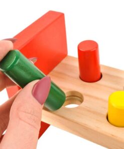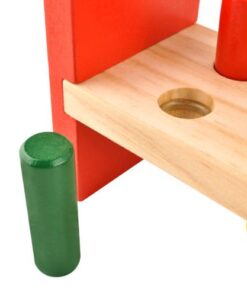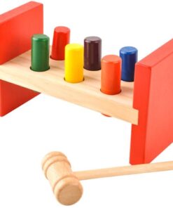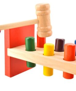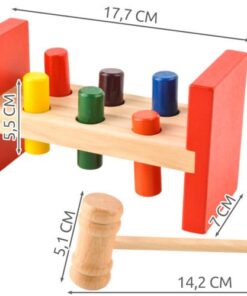 Детска дървена играчка с чук и цветни блокчета. Перфектно развива логическото мислене, двигателните умения на ръцете, координацията ръка-око; подходяща е за игра самостоятелно, с възрастни или с други деца в по-голяма група, което влияе върху развитието на социални и интеграционни умения. Детето може да практикува знанието си за цветове и дори да практикува броене по-късно. Дървените играчки са изключително издръжливи и устойчиви на повреди, благодарение на което ще останат непокътнати с години, за разлика от многобройните си събратя от пластмаса. Това е играчка, която успешно ще се използва не само за едно дете, но и за цели поколения. Цветните елементи привличат погледите на детето и го насърчават да се забавлява. Дървото, използвано за производството на играчката и мекият завършек на ръбовете, правят продукта безопасен за здравето на детето.