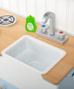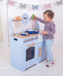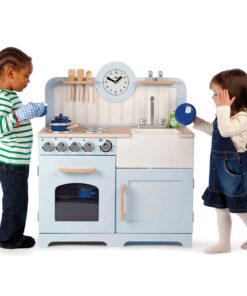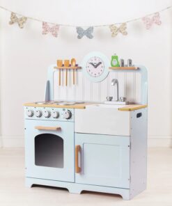 Детска дървена кухня кънтри Вдъхновете начинаещи млади готвачи да приготвят буря с възхитителната дървена Country Play Kitchen от Tidlo. Тази реалистична дървена кухня за игра разполага с фурна и котлон с щракащи дискове, шкаф за съхранение, мивка Belfast, рафтове за прибори и часовник с подвижни стрелки, за да се гарантира, че вечерята ще бъде сервирана навреме! Плюс това, три кухненски прибора, които могат да се поставят подредено в рафта над плота, пластмасова купа в мивката, сол и черен пипер и течност за миене, което кара кухнята да се чувства по-скоро като дом за всеки амбициозен готвач. Кухнята за игра е проектирана с по-висока работна повърхност, за да осигури много години игра. Предлага се и със странични дръжки за лесно транспортиране. Тази прекрасна дървена играчка е чудесен начин да научите децата на безопасност в кухнята, както и на здравословно хранене, особено когато се комбинира с храна за игра (продава се отделно). Насърчава творческата и въображаема игра. Развива координацията ръка/око и сръчността. Изисква сглобяване от възрастен. Изработен от висококачествени материали с отговорни източници. Отговаря на настоящите европейски стандарти за безопасност. Разгледайте още от категорията “Дървени детски кухни” ТУК!