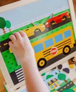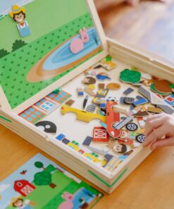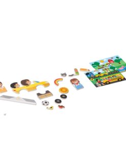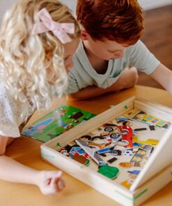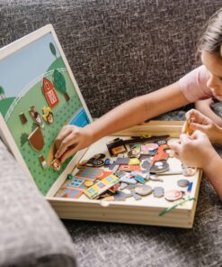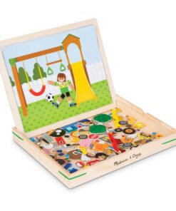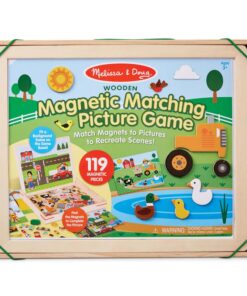 Детска дървена магнитна игра със ситуации Melissa & Doug. Комбинирайте повече от 100 дървени магнита, за да пресъздадете и вдъхнете живот на въображаеми сцени! Поставете голяма фонова сцена върху магнитната игрална дъска, изберете една от малките карти с предложения със същия фон, след това намерете и поставете магнитите, които съответстват на предложената картина. Комплектът включва 119 дървени магнита, 2 двустранни фонови карти, 4 двустранни карти с предложения, магнитна дъска за игра, която стои в здрава дървена кутия за съхранение с дръжка. Деца на три и повече години ще се забавляват, докато усъвършенстват уменията за фина моторика, съпоставяне, разпознаване на цветове и решаване на проблеми! Разгледайте още от категорията “Магнитни игра” ТУК!