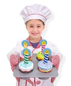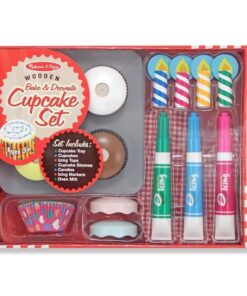 Детска играчка комплект за кексчета . Уверете се, че вашият малък пекар използва ръкавицата за фурна, за да извади тези 4 възхитително изглеждащи дървени кексчета от тавата за печене на кексчета! Този специален комплект има 3 маркера за сухо изтриване, оформени като тръбички за глазура, за украса на гладките, подвижни, избърсващи се върхове на кексчета. С 8 цветни плика за печене на кексчета и 4 декоративни дървени свещи, тези нискокалорични кексчета ще бъдат хитът на рождени дни и чаени партита! Разгледайте още от категорията “Дървени играчки за готвене” ТУК