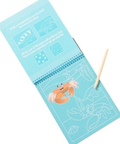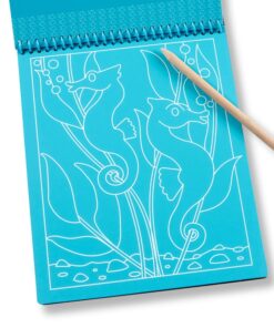 Детска книжка скреч Морски животни Всичко включено в тази книжка Scratch Art със спираловидна подвързия и разкриване на цветове носи цветни подводни приключения навсякъде, където децата могат да отидат! Използвайте включения дървен стилус, за да надраскате повърхността, да гравирате детайли и да разкриете 12 сцени от морския живот, включващи скатове, морски кончета, акули и др. Забавни факти и идеи за модели, включени за всяка страница! Разгледайте още продукти в категорията “Творчески комплекти” – ТУК
