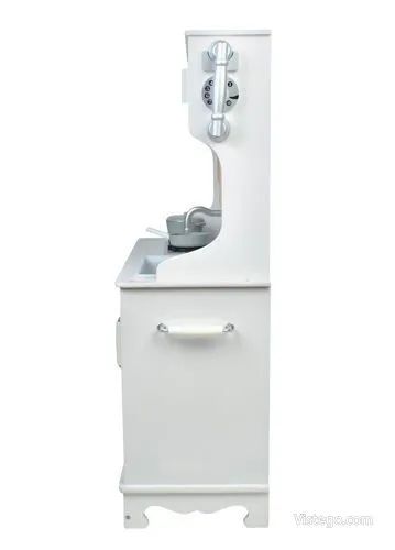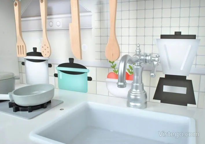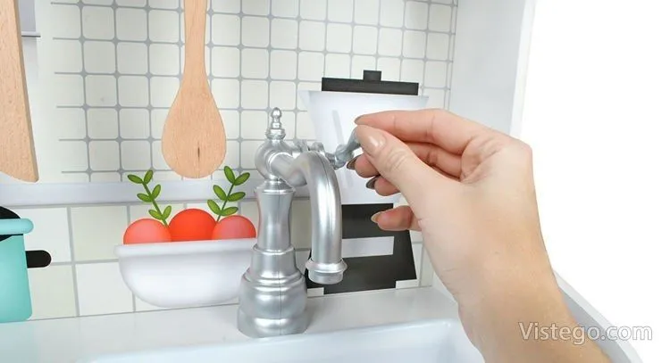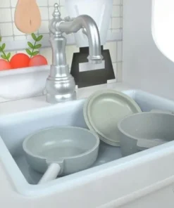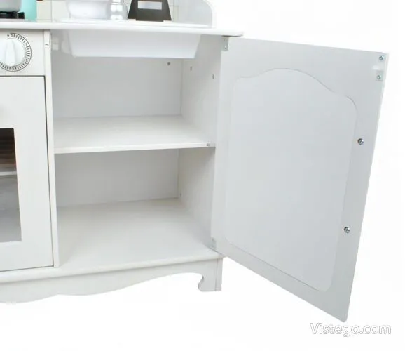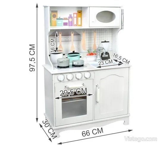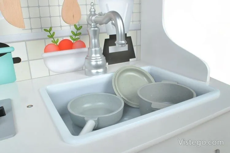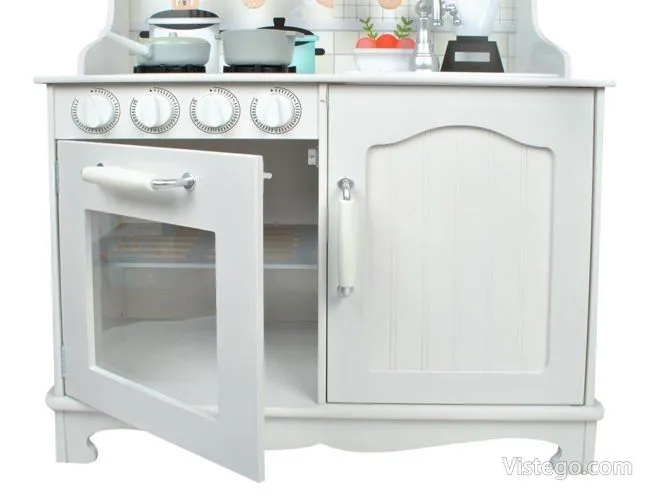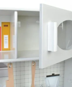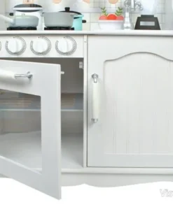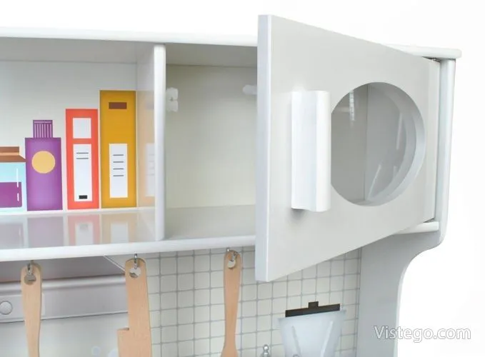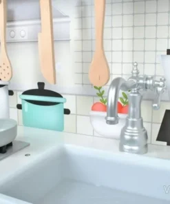 Тази детска кухня от дърво е проектирана така, че малкият готвач да има „работни“ зони, които да използва в различни игри. Налични са мивка, фурна и котлони, а към тях е добавена и реалистична микровълнова фурна, която прави сценариите още по-правдоподобни. При завъртане на ключовете на котлоните се чува кликащ звук, което допринася за усещането, че детето „готви“ като възрастните.