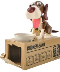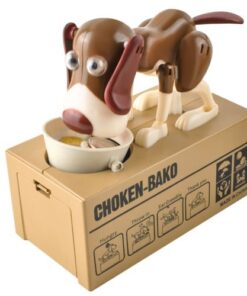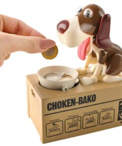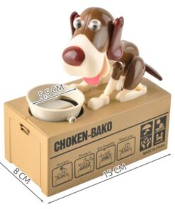 Детска куче-касичка за монети на батерии. Чудесен начин да научите децата си как да пестят пари по забавен и привлекателен начин. Касичката се състои от сандък, който се затваря с тапа, през която можете да извадите натрупаните монети и да направите мечтата на малко дете да се сбъдва, не е нужно да се унищожава като емблематичните касички. Кучето движи очите, езика, ушите, главата, лапите и опашката, докато пускате монетата, като също издава звук. Със сигурност ще насърчи детето да пести и в същото време ще бъде хубава декорация в стаята. Просто поставете монетата в купата пред кучето и под натиска на сензора, кучето започва да реагира, сякаш яде храна от купата, карайки монетата да се изплъзне в касичката.