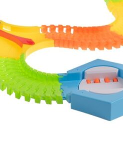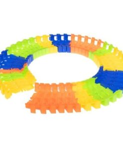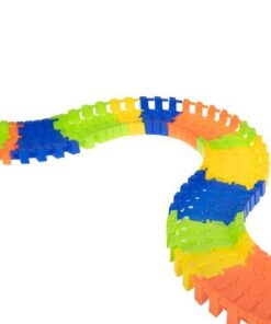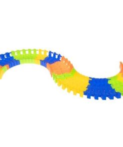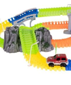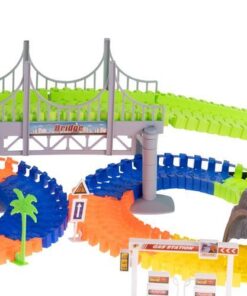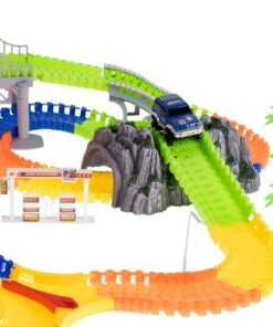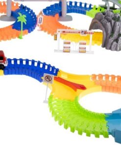 Детска писта за колички с аксесоари. Автомобилите се захранват от батерии, благодарение на които се движат по трасето с висока скорост, а сцеплението им е достатъчно силно, за да не излитат извън пистата! Бъгитата също имат червени и сини мигащи светлини. Частите от пистата са гъвкави, можете да ги подреждате свободно – възможностите са безкрайни, разположението на пистата и посоката на движение могат да се променят дори по време на движение! Комплектът включва 3 мостчета, така че детето може да строи и хълмове или тунели. Частите на пистата се закрепят здраво едно към друго, така че е лесна за сгъване и конфигуриране, детето може да подреди една дълга или няколко по-малки. Светещата писта за кола несъмнено е една от онези играчки, с които не само едно дете ще иска да играе, но и цялото му семейство. Времето, прекарано заедно, със сигурност ще се отплати. Пистата оказва голямо влияние върху интелектуалното развитие на детето, развива положително двигателните му умения, помага за развитието на координацията око-ръка. Изграждането на писта стимулира въображението му и перфектно развива ръчните умения. Включено: 240 елемента на пистата, 8 твърди парчета писта, 2 коли, бензиностанция, 3 знака, 3 фара, 4 палми, 2 планински тунела, начално, кръстовище, 28 мостови елемента.