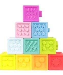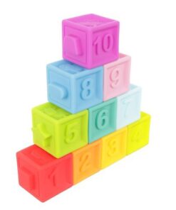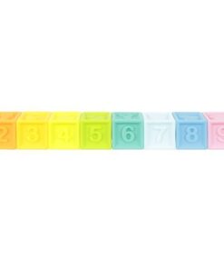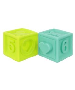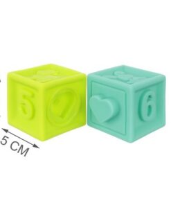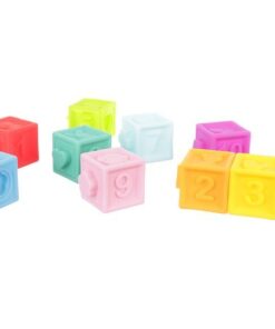 Детски гумени кубчета за игра с букви и цифри. Комплектът се състои от 10 кубчета, които се характеризират с разнообразие от форми и цветове. Те съдържат числа, шарки и изображения на най-популярните животни. Благодарение на факта, че са изработени от олекотен гумен материал, могат да се използват и като залагалки за бебета – безвредни са за здравето и имат гладки ръбове, за да може детето да играе безопасно. Използваният при производството материал се характеризира с издръжливост, което се отразява положително върху издръжливостта и полезния живот на кубчетата. Освен това са водоустойчиви и много лесни за почистване.