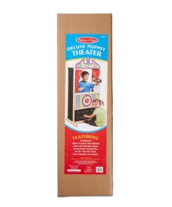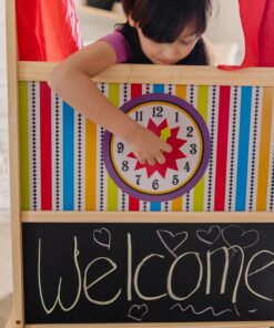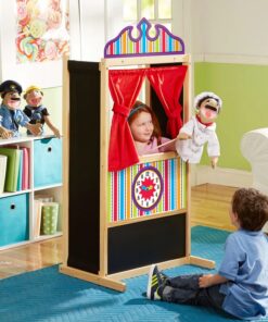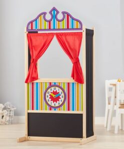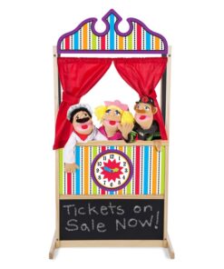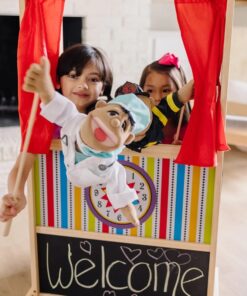 Детски дървен куклен театър Голям Melissa & Doug. Време е за шоу! Този дървен куклен театър е проектиран със здрава, устойчива на накланяне основа и много място вътре за един-двама кукловоди! Стилизираните театрални графики и плюшените, кадифени завеси ще вдъхновят креативността и изявата на всяко дете. Включително часовник с подвижни стрелки и панел с черна дъска за информация в афиша, това е сцена, която просто очаква въображение! Разгледайте още от категорията “Кукли за ръце за куклен театър” ТУК!