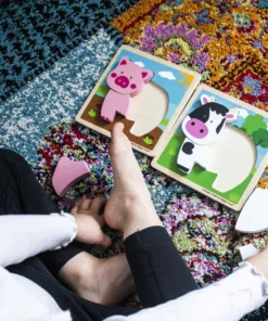 Детски дървен пъзел Прасенце от фермата . Chunky Lift-Out Pig Puzzle има четири масивни части от пъзел, които правят розово прасенце. Чудесен начин за заетите малки ръчички да хващат, поставят и разглеждат, както и да научат за прасетата и звуците, които издават. Този дървен пъзел с розово прасенце от фермата за малки деца се предлага в комплект с гладка дървена дъска с красива сцена от селския двор. Малките деца също могат да започнат пътуването си с броене, като броят парчетата от пъзела от 1 до 4. Също така помага за развитието на фини двигателни умения и сръчност. Изработен от висококачествени материали с отговорни източници. Покрити с нетоксични бои и лакове. Отговаря на настоящите европейски стандарти за безопасност. Подходящ за 12 месеца +. Разгледайте още от категорията “Дървени пъзели” ТУК!