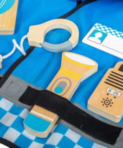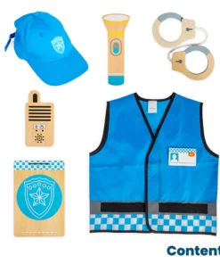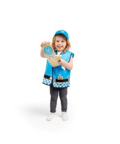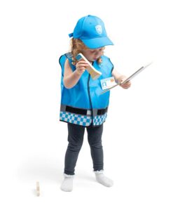 Детски карнавален костюм на полицай Bigjigs. Спаси обществото от злодеите с този забавен детски полицейски костюм. Нашата колекция включва синя полицейска жилетка, бейзболна шапка, дървени дръжки за бой, лична значка, портфейл за лична карта, фенерче и маншети. Тези костюми са подходящи за деца на възраст от 3 до 5 години. Жилетката има размери 40,5 см ширина и 44 см височина, а шапката е регулируема с размери от 48 до 57 см. Всички продукти са тествани в съответствие с последните изисквания на EN71 & REACH. Разгледайте още от категорията “Детски карнавални костюми” ТУК!