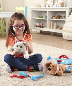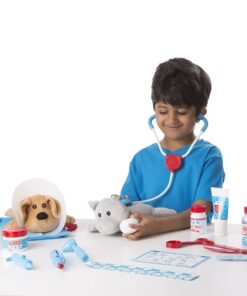 Детски комплект за ветеринар Melissa & Doug. Дайте на младите любители на животните всичко необходимо за преглед и лечение на мними домашни любимци! Тази играчка е призната от експерти по играчки в Good Housekeeping Institute за начина, по който помага на децата да развият емпатия. Колекцията от 24 части за амбициозни ветеринари на три и повече години се предлага с два очарователни плюшени домашни любимци (куче и котка) и изобилие от аксесоари, включително стетоскоп, термометър, спринцовка, ушна тръба, пинсети и скоба. Има бутилки, туби и вани с фалшиви лечения и мехлеми, превръзки и гипс за бу-бу и дори „конус“ за врата, който предпазва домашните любимци от облизване! Всичко, включително контролен списък за прегледи за многократна употреба, се съхранява в удобна чанта, така че малките ветеринари да могат да посещават дома! Разгледайте още продукти в категорията “Детски инструменти” – ТУК!